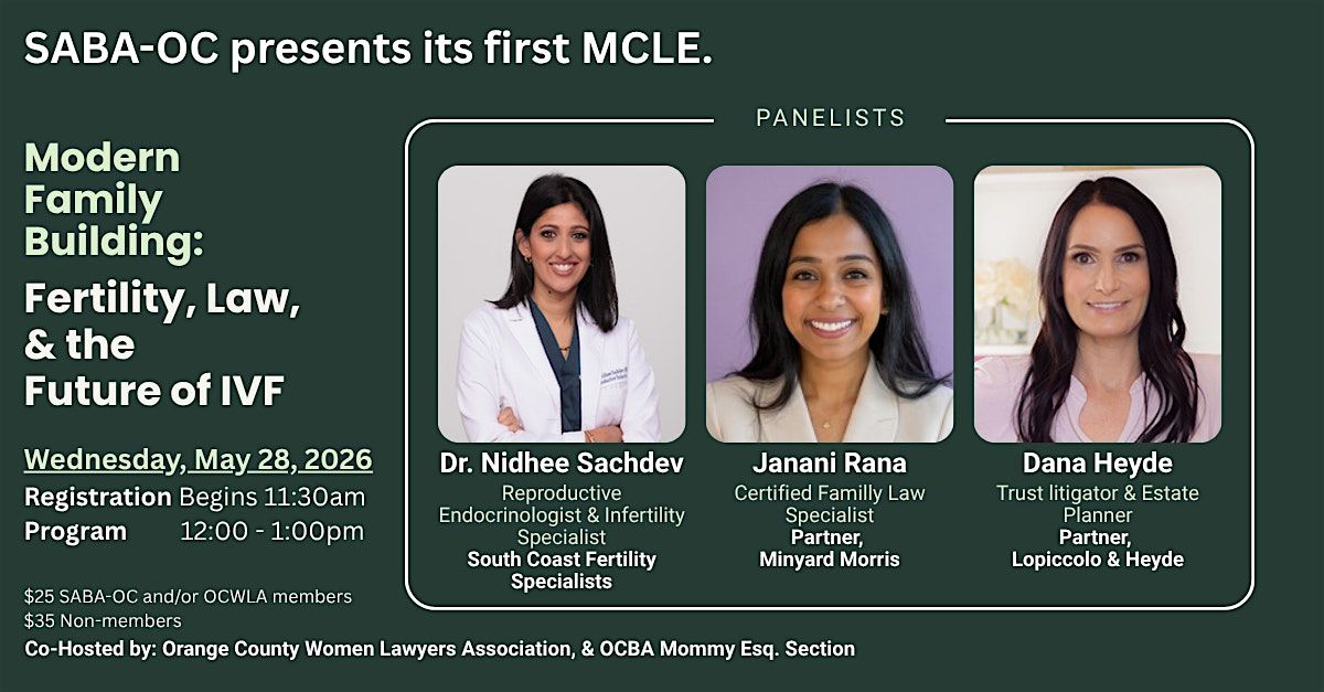 Join SABA Orange County, OCWLA, and OCBA Mommy Esq., for an insightful deep dive into fertility, law, and the future of IVF. Whether you're curious about the latest family building trends or want to understand the family law or estate planning side of fertility, this panel has got you covered.