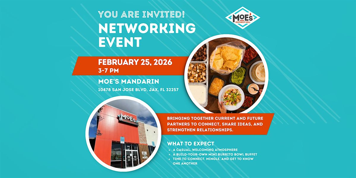 We can't wait to WELCOME YOU TO - Moe's Southwest Grill in Mandarin for an afternoon of networking and community building! Whether you're looking to host a Spirit Night, seeking local sponsorships, or planning your next big catered event, our team is here to show you how "we do it all." Come meet the faces behind the counter, chat about potential partnerships, and enjoy some of our world-famous queso while you mingle with fellow local leaders.