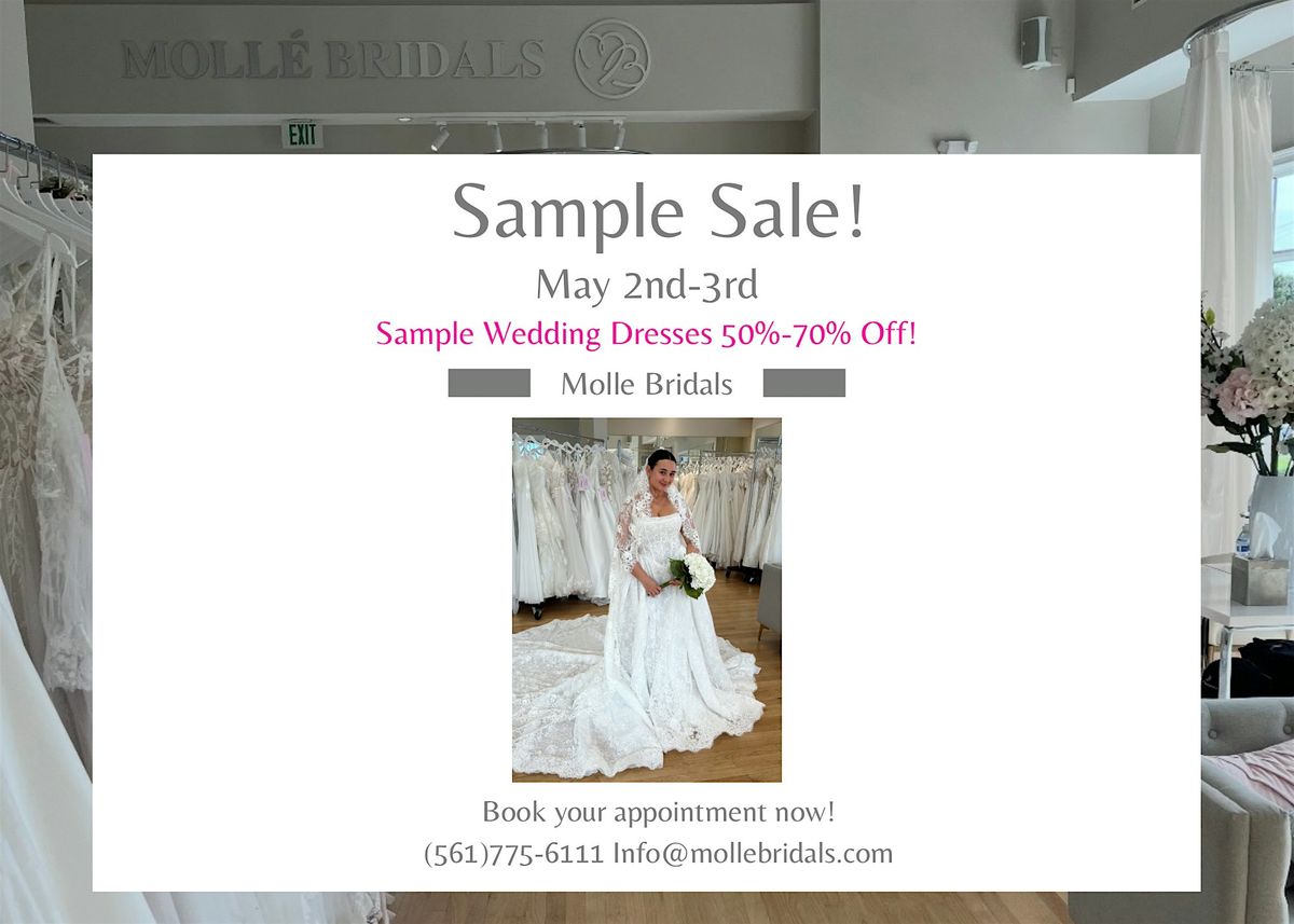 Our Sample Sale event is on May 2nd-3rd! This is the sale everyone waits ALL YEAR for! Sample sale dresses are first come, first served and take-home SAME DAY with discounts of 50-70% OFF - as low as $999! Call (561)775-6111 or visit www.mollebridals.com to schedule your appointment!