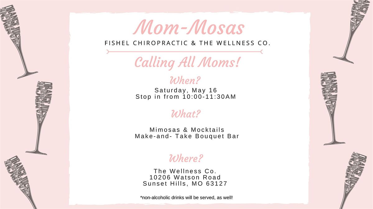 Mark your calendar! You're invited to our FREE Mom-Mosas event on Saturday, May 16th from 10:00 –11:30 AM, hosted by Fishel Chiropractic !