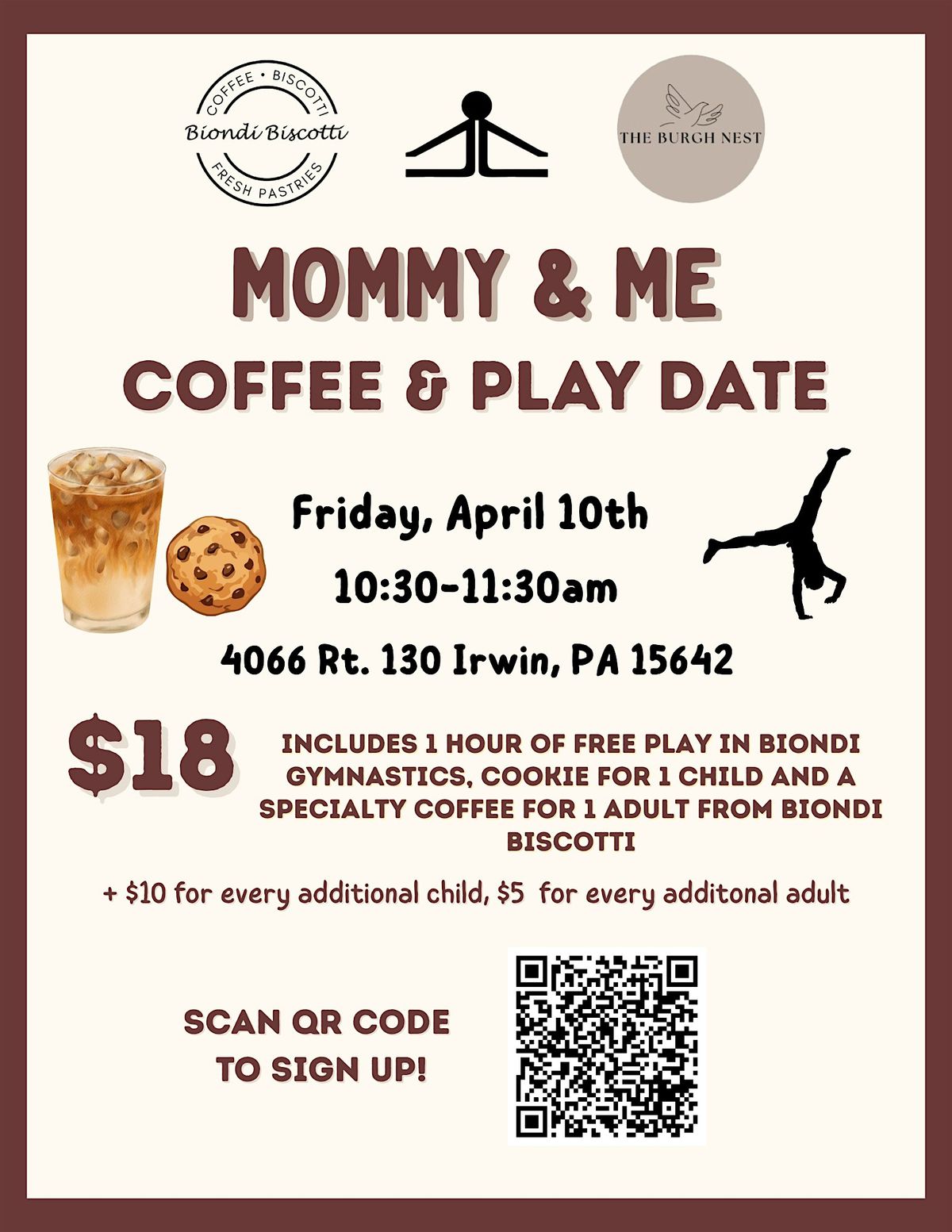 Meet & mingle with other local Moms over coffee and a sweet treat from Biondi Biscotti while your kiddo(s) explore and play in Biondi Gymnastics! $18 ticket includes 1 hour of free play, a cookie for 1 child and a specialty coffee of choosing for 1 adult. ($10 for every additional child, $5 for every additional adult)