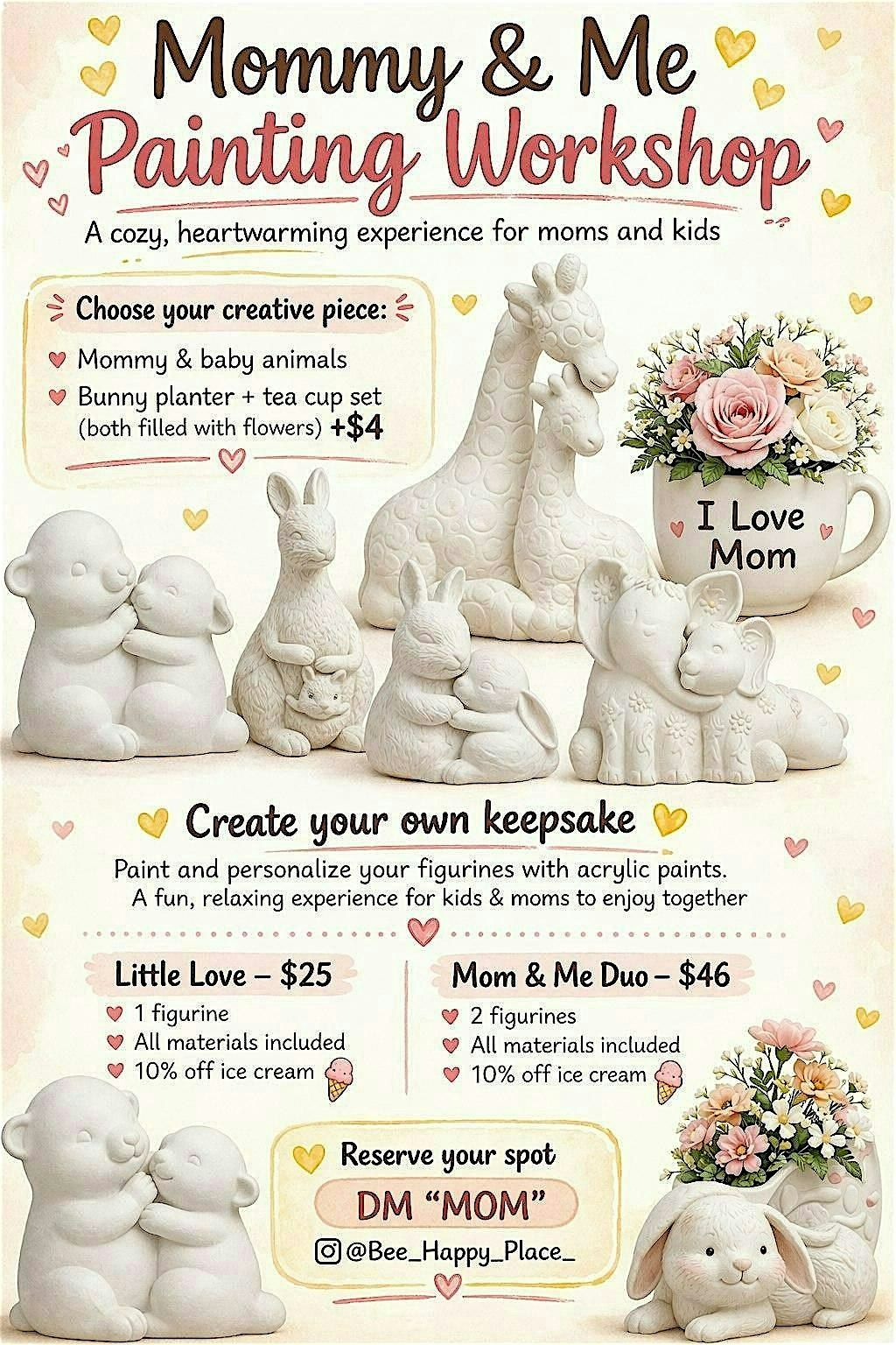 It’s a simple, heartwarming experience where you and your child can paint adorable mommy & baby figurines (bunny, elephant, panda, giraffe, kangaroo) or choose a cute planter teacup or bunny (both can be filled with a flower pot for an additional $4) — and enjoy a sweet ice cream treat together 🍦🌸🌸