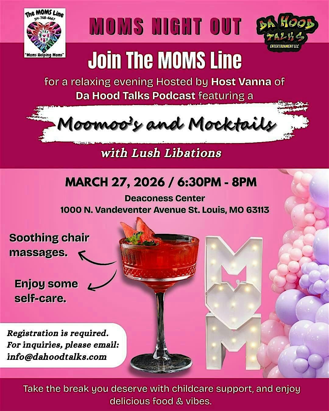 Join Host Vanna from Da Hood Talks Podcast for Moms Night Out with The Moms Line at Deaconess Center on March 27th 2026 at 6:30 PM CT for a night of fun and relaxation. It's time for all the amazing expectanting and postpartum folks only out there to kick back, unwind, and enjoy some well-deserved self care.