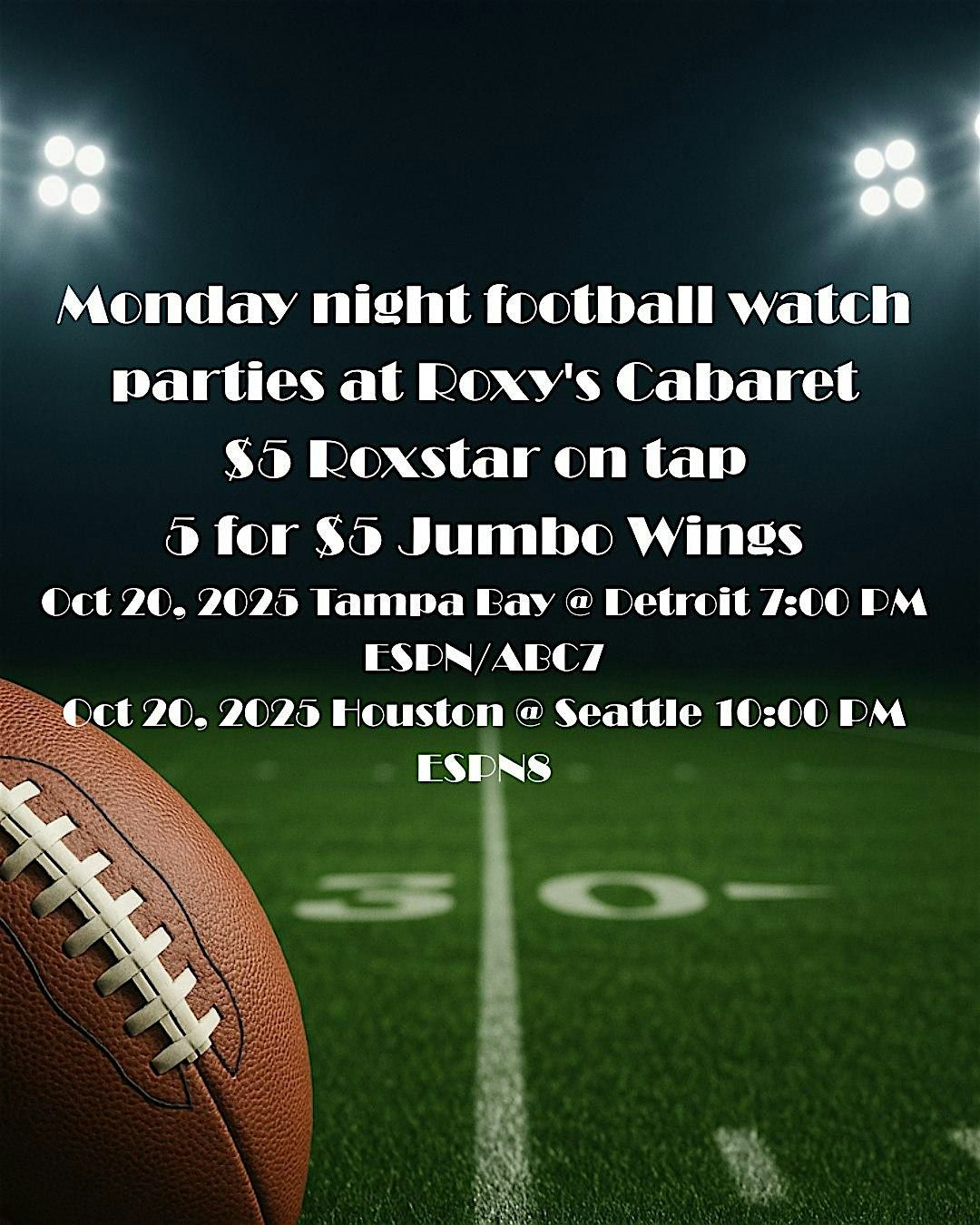 Join us Monday night as Roxy’s Cabaret transforms into your go-to game-day destination! Catch all the Monday Night Football action on the big screens in our lively, cabaret-meets-sports-bar atmosphere — where the energy is high, the drinks are cold, and the food hits just right.