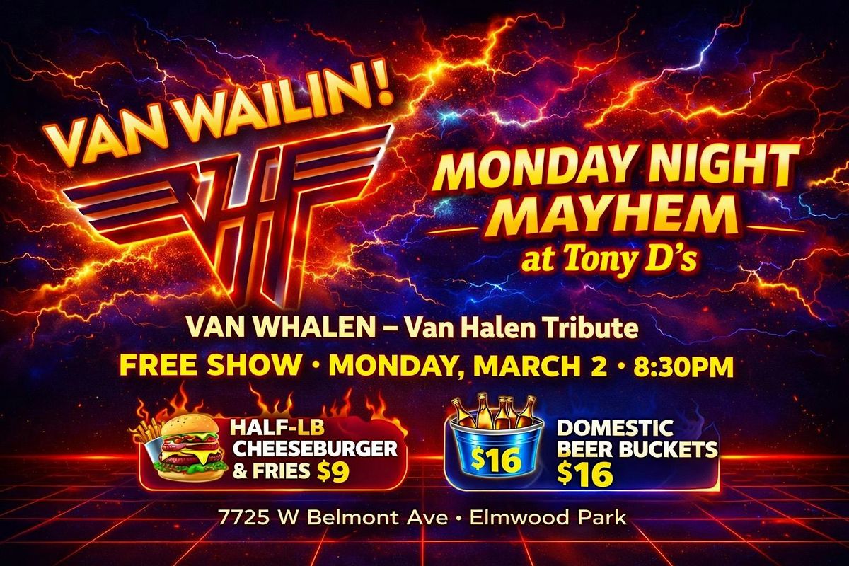 Get ready for a killer night of classic rock vibes! Van Wailin is bringing the energy and awesome tunes of Van Halen straight to Tony D's. It's an in-person show packed with all the hits that'll make you wanna jump, shout, and sing along. Don't miss out on this epic tribute night – see you there for some serious Monday Night Mayhem!