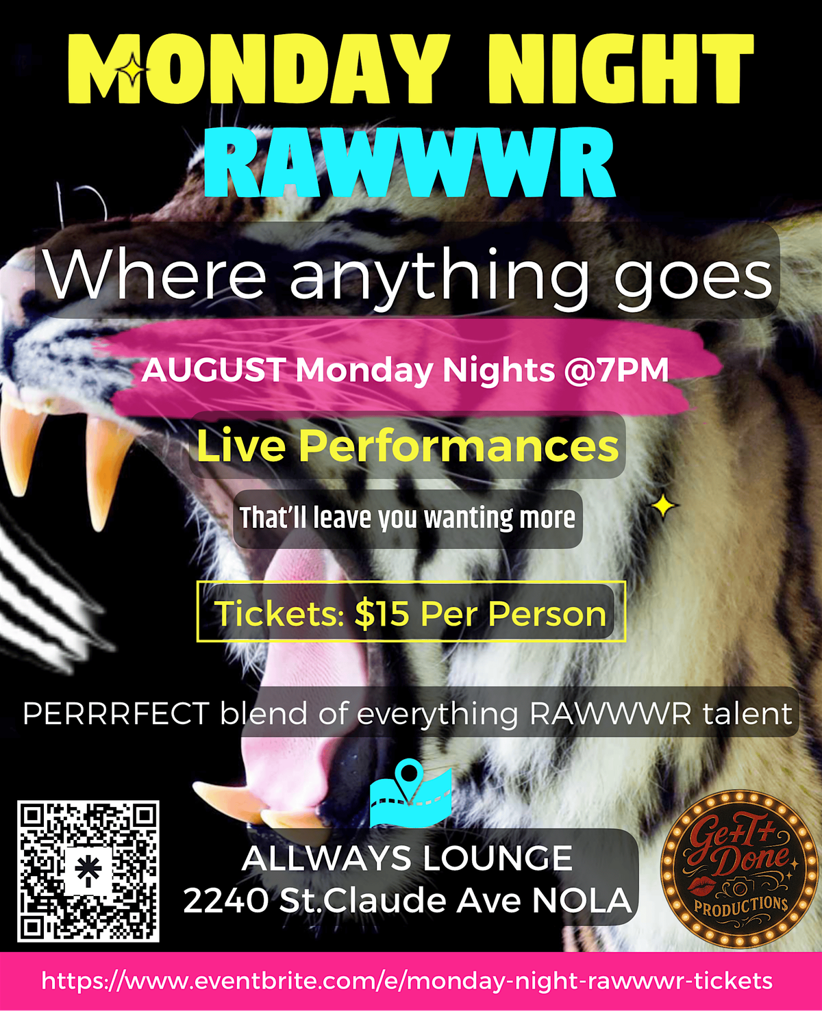 It’s time to shake off those Monday blues and dive into some fun in person action. Join us for Monday Night RAWWWR—a perfect way to kickstart your week with good vibes, great company, and plenty of excitement. Whether you’re here to chill or get wild, this night’s got you covered. Don’t miss out on the fun, see you there!