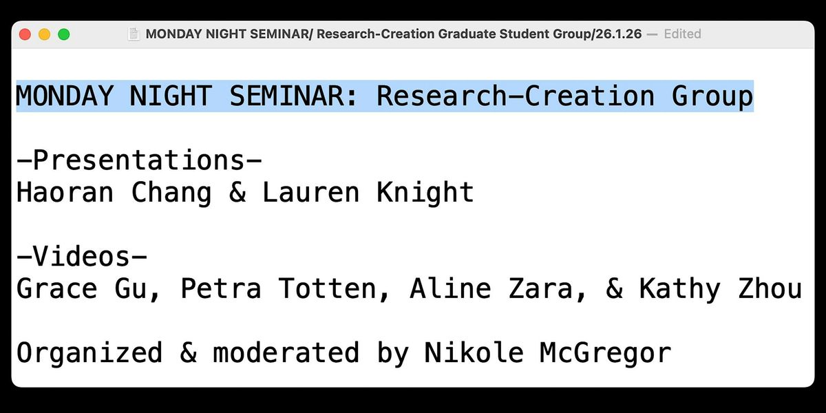 In this Monday Night Seminar, group members will present their projects-in-process through a program of talks and video screenings.
