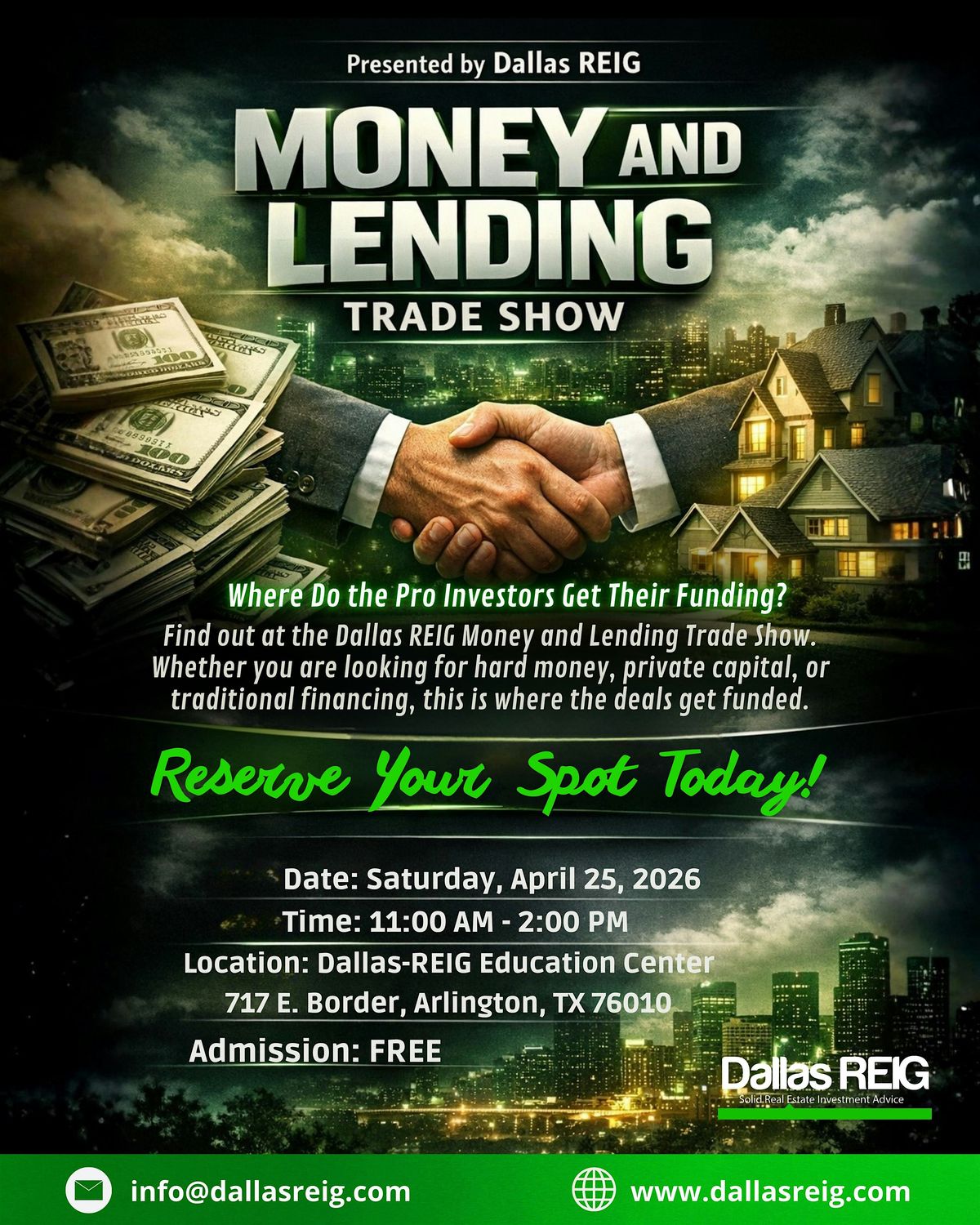 Join Dallas REIG’s Money and Lending Trade Show, an exclusive real estate–focused event designed to connect investors with the funding sources, strategies, and experts needed to close more deals in today’s market.