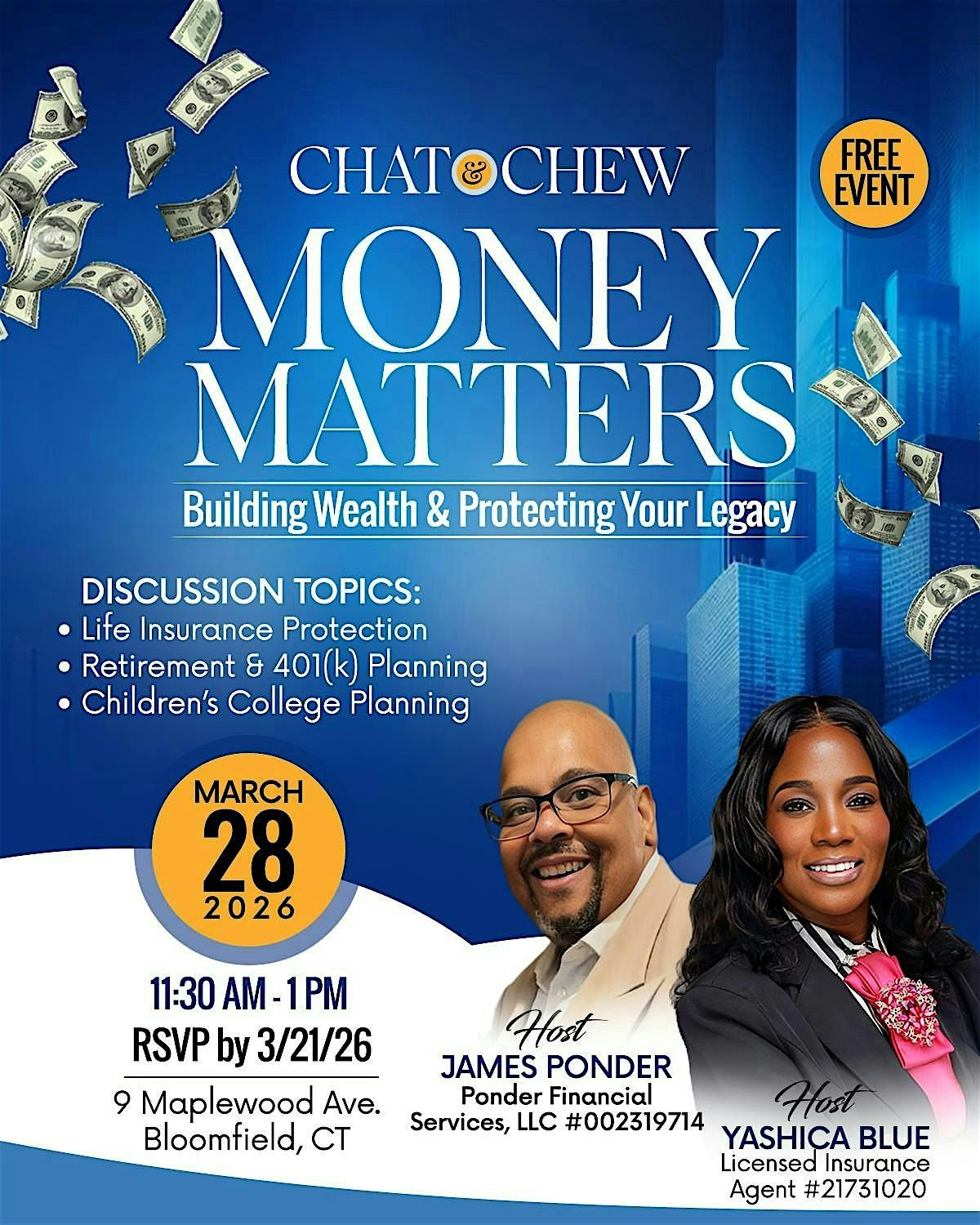 Join us for Chat & Chew: Money Matters. Learn about life insurance, retirement planning & wealth building while enjoying a delectable lunch.About this Event