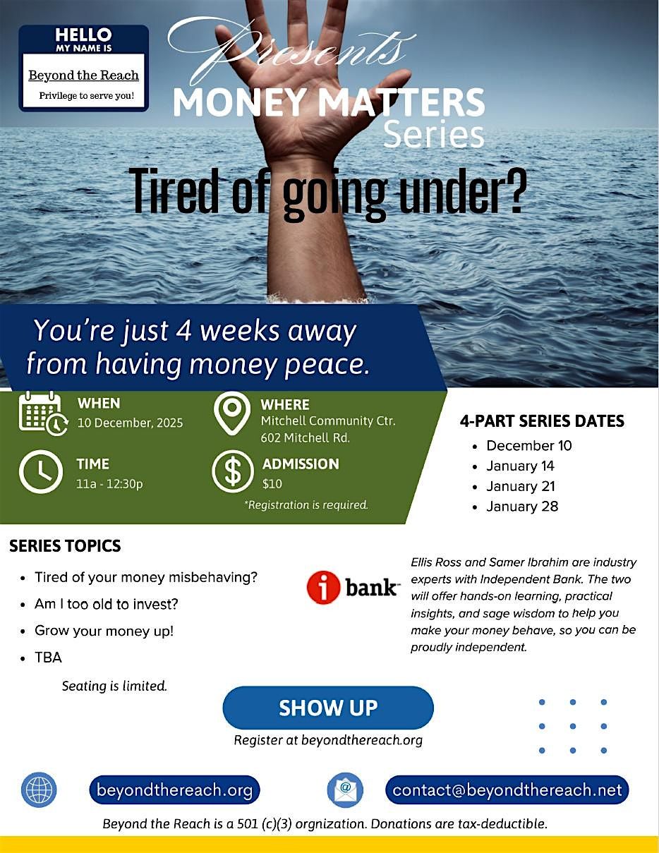Are you tired of living paycheck to paycheck or feeling unsure about your financial future? The Money Matters Series, presented by Beyond the REACH, is a powerful 4-part, hands-on workshop designed to help you gain control of your money and build lasting financial confidence.