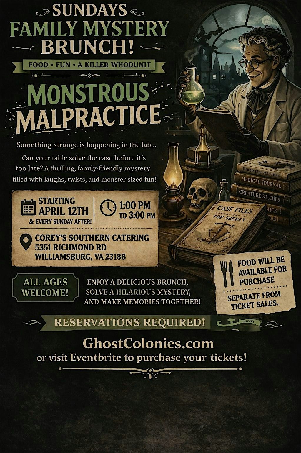 Get ready for a spooky and fun-filled adventure the whole family can enjoy! Join us in person for the Monstrous Malpractice Family Mystery Show where you'll unravel creepy clues and solve eerie puzzles together. Perfect for kids and adults who love a good mystery with a twist of monster madness. Don't miss out on this unforgettable, laughter-packed experience!