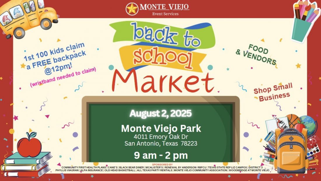 Visit the website to see what vendors have signed up as well as for the most up-to-date information - https://monteviejocommunityevents.com/back-to-school-market
