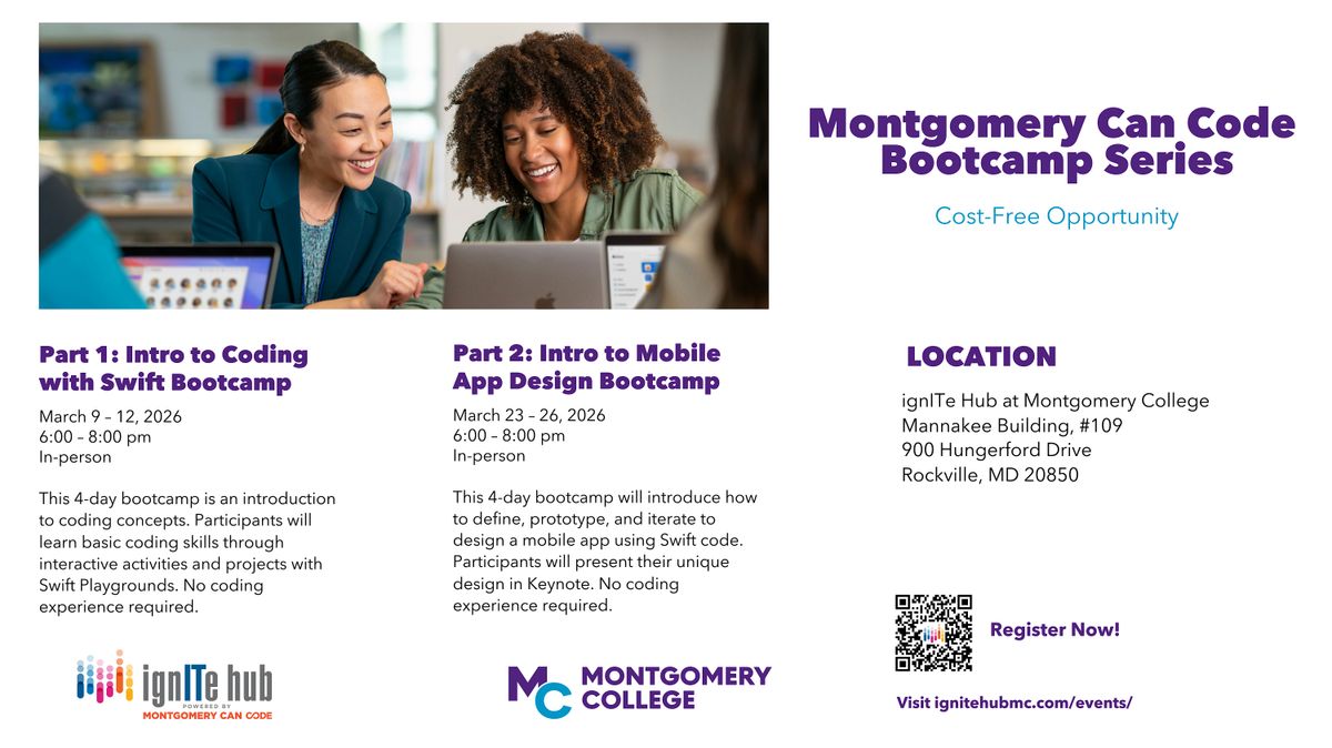 The ignITe Hub is offering a free, 2-part Intro to Coding and App Design Bootcamp for adults. Community members will learn coding concepts with Swift Playgrounds – a free app for iPad that makes getting started with Swift code interactive and fun, and how to design mobile apps for Apple devices, build a prototype, and present their projects. The bootcamps are in-person at the ignITe Hub at Montgomery College.