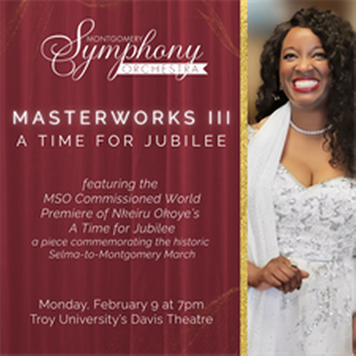✨ Enter a world of endless possibilities at Montgomery Symphony Orchestra - Masterworks III: A Time for Jubilee at The Davis Theatre, where every moment tells a story! 🏛️ The stunning The Davis Theatre in vibrant Montgomery, AL transforms into a realm of wonder on February 9th, 2026 at 07:00 PM. 🌟 They have crafted an experience that goes beyond the ordinary, combining elements of surprise, delight, and pure entertainment. Every detail has been thoughtfully considered to ensure your journey with us is nothing short of extraordinary. 🎯 Join fellow adventure seekers and memory makers in this celebration of imagination and innovation. 🎊 Reserve your spot today and be part of something truly special!