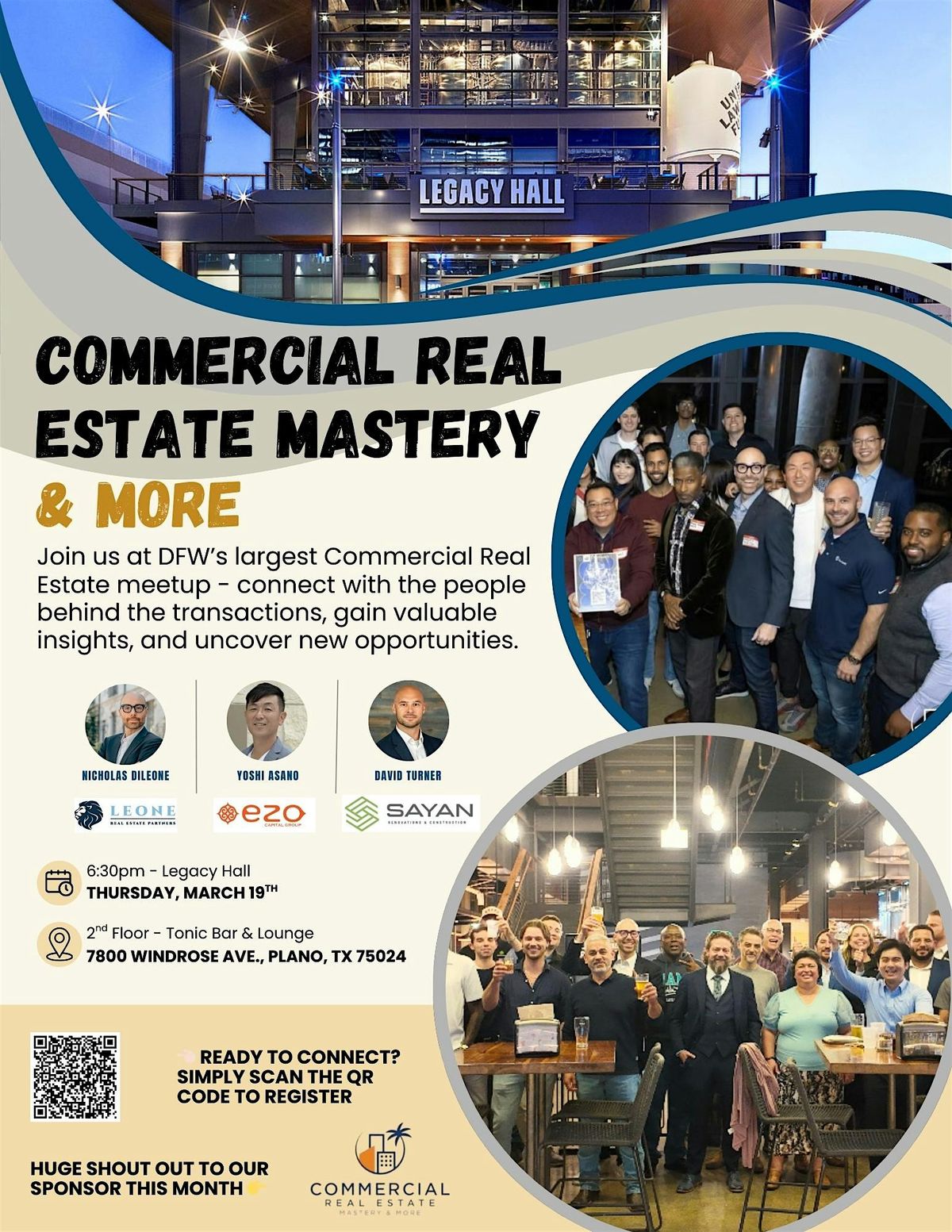 Your hosts Nick DiLeone, Yoshi Asano, and David Turner are excited to welcome you to DFW’s largest commercial real estate meetup at Legacy Hall in Legacy West (Plano).
