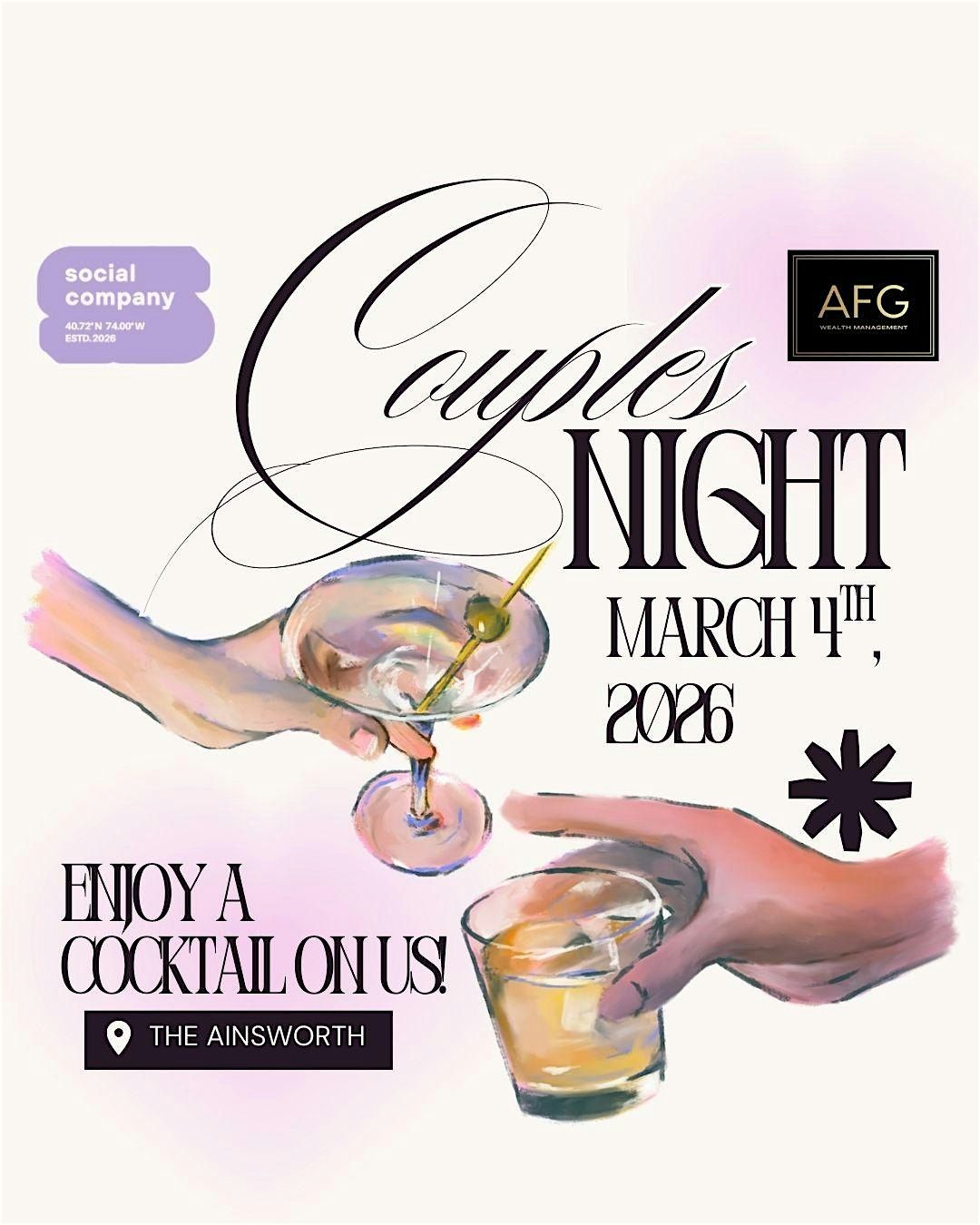 A monthly social for Hoboken + Jersey City couples. Join us for this after work social with your partner and other local couples.