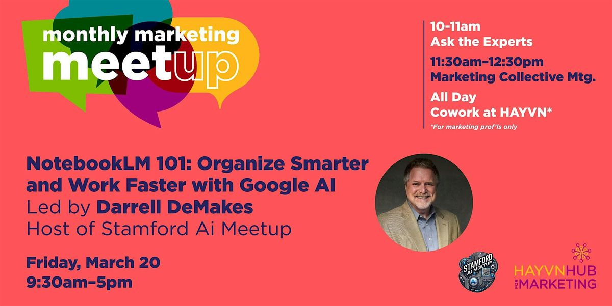 - 11:30am-12:30pm: Marketing Collective Monthly Meetup Overview: NotebookLM 101: Organize Smarter and Work Faster with Google AI led by Darrell DeMakes, Host of Stamford AI Meetup. (See more info below)