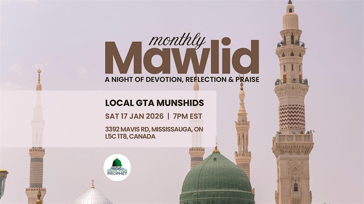 Join us for our Monthly Mawlid at the Know Your Prophet Centre (KYPC)—an uplifting evening of love and remembrance of the Prophet ﷺ. Experience soulful nasheeds and qasā’id led by our local GTA Munshids in a warm, welcoming atmosphere. All are welcome to gather, remember, and celebrate together.
