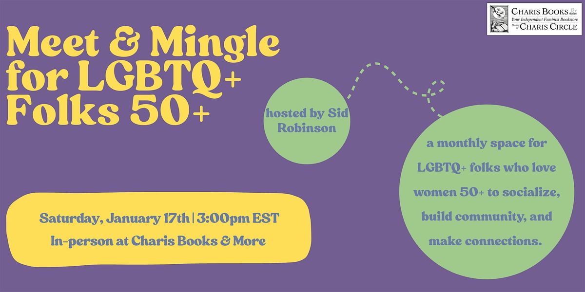 Charis Books and More is excited to bring our community a monthly space for LGBTQ+ Singles who love women 50+ to socialize, build community, and make connections. By single we mean available to mix and mingle - polyamorous folks are welcome and encouraged to attend. The purpose of this group is to celebrate and connect with other LGBTQIA folks & women 50+. We will not fade into the background. We are alive, vibrant, and sexy! If you are LGBTQIA, single, and love women 50 and over, this group is for you! Let’s move past anxiety and fear. Take a deep breath. Get out of your head and into your heart - that’s where connection with others is possible.This group will meet at Charis on the 3rd Saturday of each month from 3:00pm-4:30pm ET. Join us on Saturday, January 17th at 3:00pm EST!
