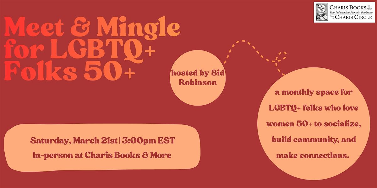 Charis Books and More is excited to bring our community a monthly space for LGBTQ+ Singles who love women 50+ to socialize, build community, and make connections. By single we mean available to mix and mingle - polyamorous folks are welcome and encouraged to attend. The purpose of this group is to celebrate and connect with other LGBTQIA folks & women 50+. We will not fade into the background. We are alive, vibrant, and sexy! If you are LGBTQIA, single, and love women 50 and over, this group is for you! Let’s move past anxiety and fear. Take a deep breath. Get out of your head and into your heart - that’s where connection with others is possible. This group will meet at Charis on the 3rd Saturday of each month from 3:00pm-4:30pm ET. Join us on Saturday, March 21st at 3:00pm EST!