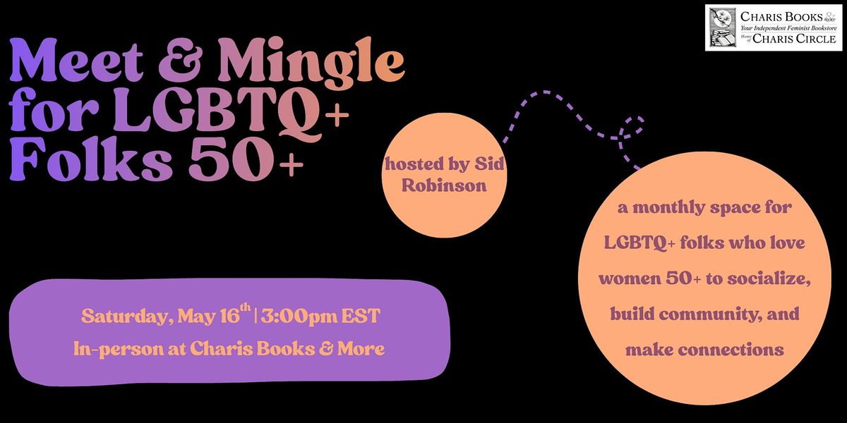 Charis Books and More is excited to bring our community a monthly space for LGBTQ+ Singles who love women 50+ to socialize, build community, and make connections. By single we mean available to mix and mingle - polyamorous folks are welcome and encouraged to attend. The purpose of this group is to celebrate and connect with other LGBTQIA folks & women 50+. We will not fade into the background. We are alive, vibrant, and sexy! If you are LGBTQIA, single, and love women 50 and over, this group is for you! Let’s move past anxiety and fear. Take a deep breath. Get out of your head and into your heart - that’s where connection with others is possible.This group will meet at Charis on the 3rd Saturday of each month from 3:00pm-4:30pm ET. Join us on Saturday, May 16th at 3:00pm EST!