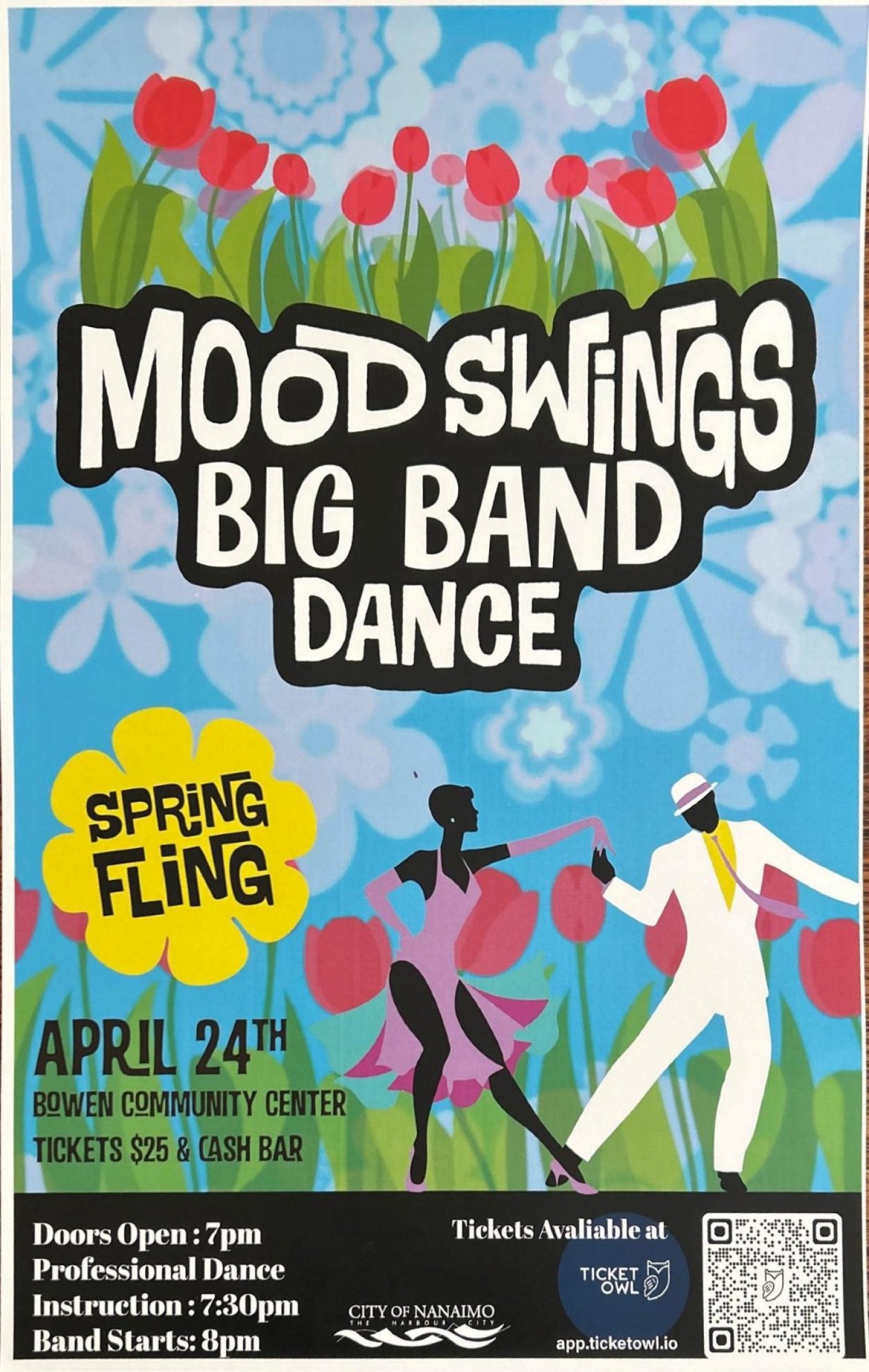 Welcome dancers to Spring Fling Event with live music by Mood Swings Big Band. All levels of dancers welcome. There will be an introduction to Ballroom, and Swing dance lead by local instructor Nelson Wong at 7:30 pm. Tickets $25, Cash Bar (Beer & Wine) + Water, Pop, Snacks