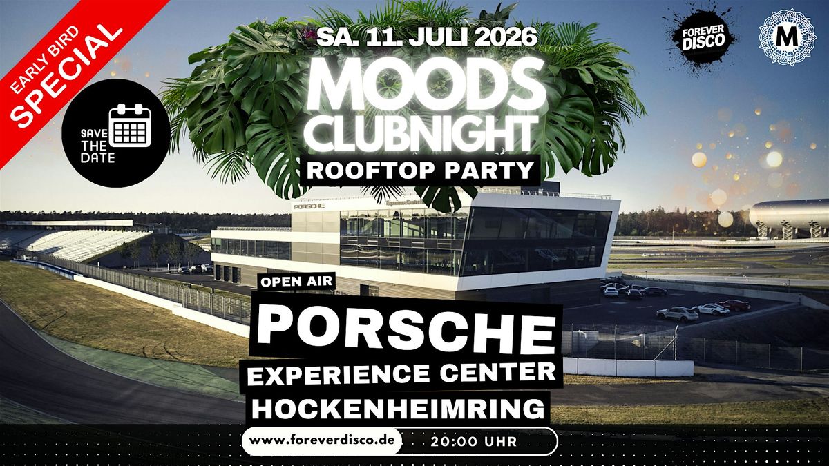 Die MOODS SUMMER CLUBNIGHT lädt dich am 11. Juli 2026 auf das spektakuläre Rooftop des Porsche Experience Centers am Hockenheimring ein – mit atemberaubender Aussicht, exklusivem Flair und feinster Musik.