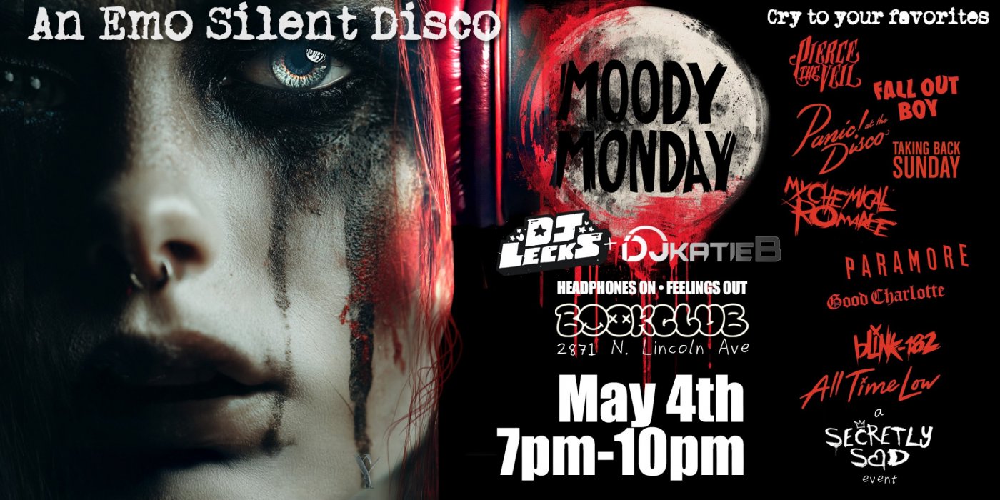 Headphones on! Feelings out! Get ready to relive your angsty youth in rocking silence as our DJ's battle it out! Secretly Sad presents "Moody Monday: An Emo Silent Disco." Brininging you the best emo/punk events across Chicago and greater Illinois! Join us Monday, May 4th at Bookclub Chicago for a night of moody madness!