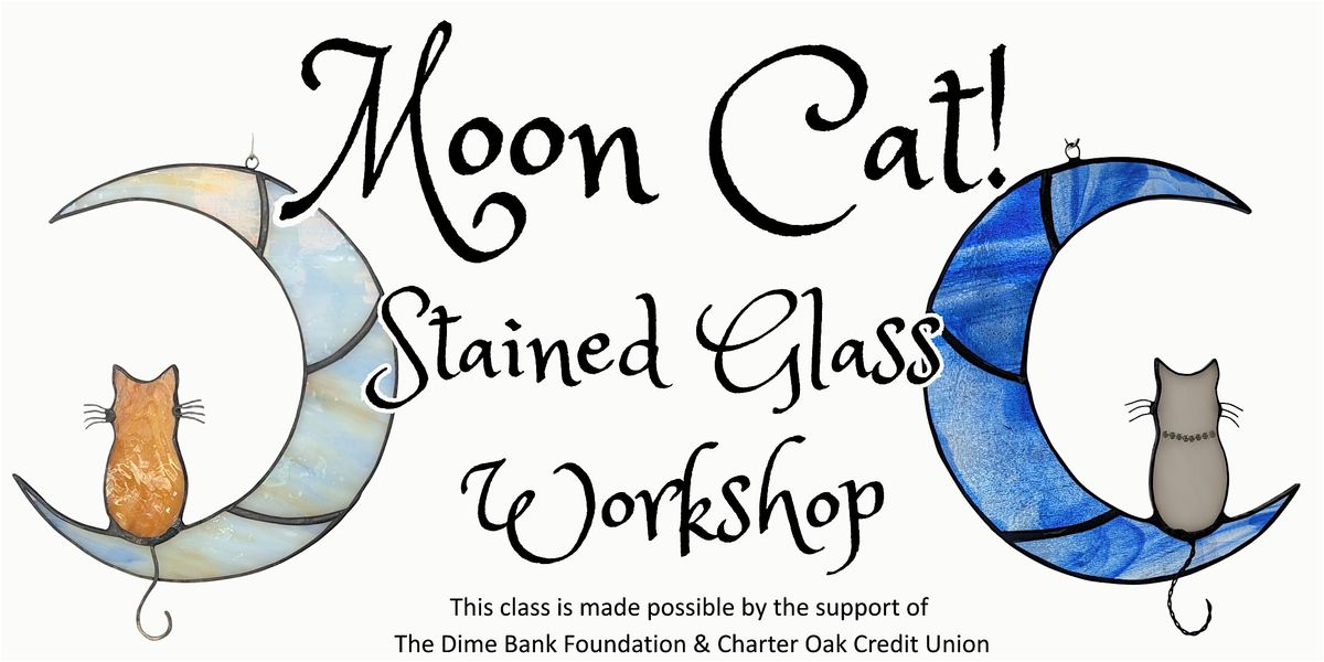 Attention cat lovers! Make a colorful stained glass crescent moon with a cat perched upon it. In this beginner-level workshop, you will learn the copper foil method of stained glass assembly, including glass cutting, grinding, foiling, and soldering. Participants will have a choice of 5 colors of pre-cut kitties. You will also work with wire to add details (and tails!) Finished hanging piece is approx. 7” in diameter.