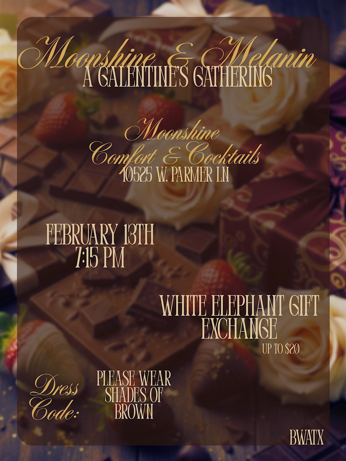 Join us for a Moonshine & Melanin: A Galentines Gathering starting at 7:15 PM for a night dedicated to friendship, and laughter! Please wear brown🤎✨