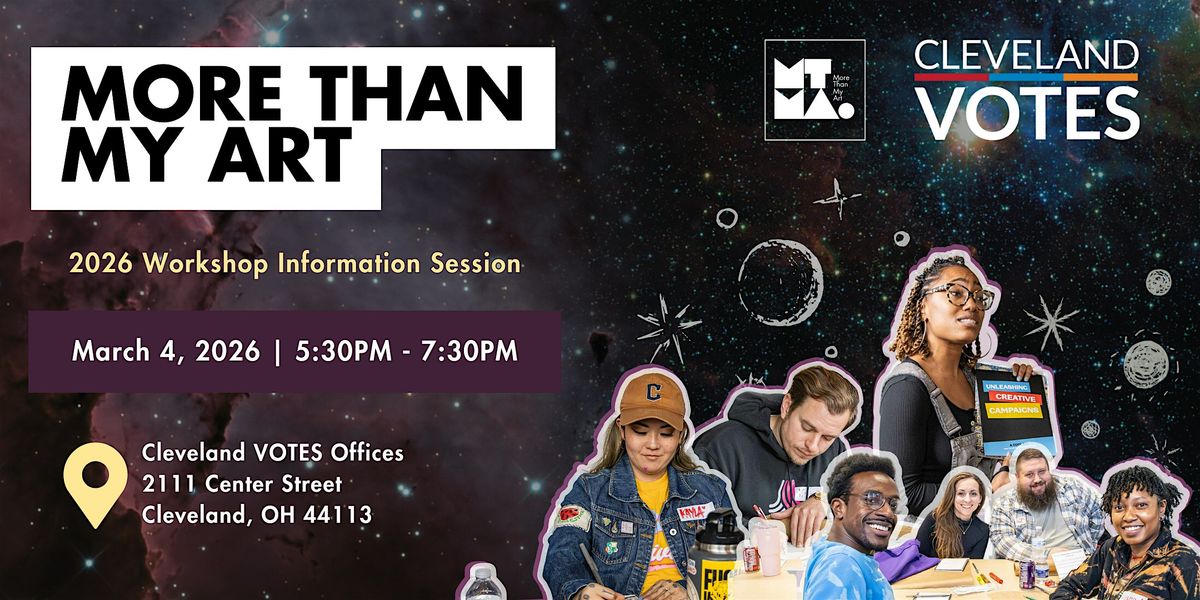Join us at the new Cleveland VOTES office for an information session on the 2026 More Than My Art (MTMA) Spring Workshop Series! Learn more about the workshops, hear from MTMA Ambassadors about their experiences, enjoy food, and network with like-minded creatives and democracy builders from across the city.