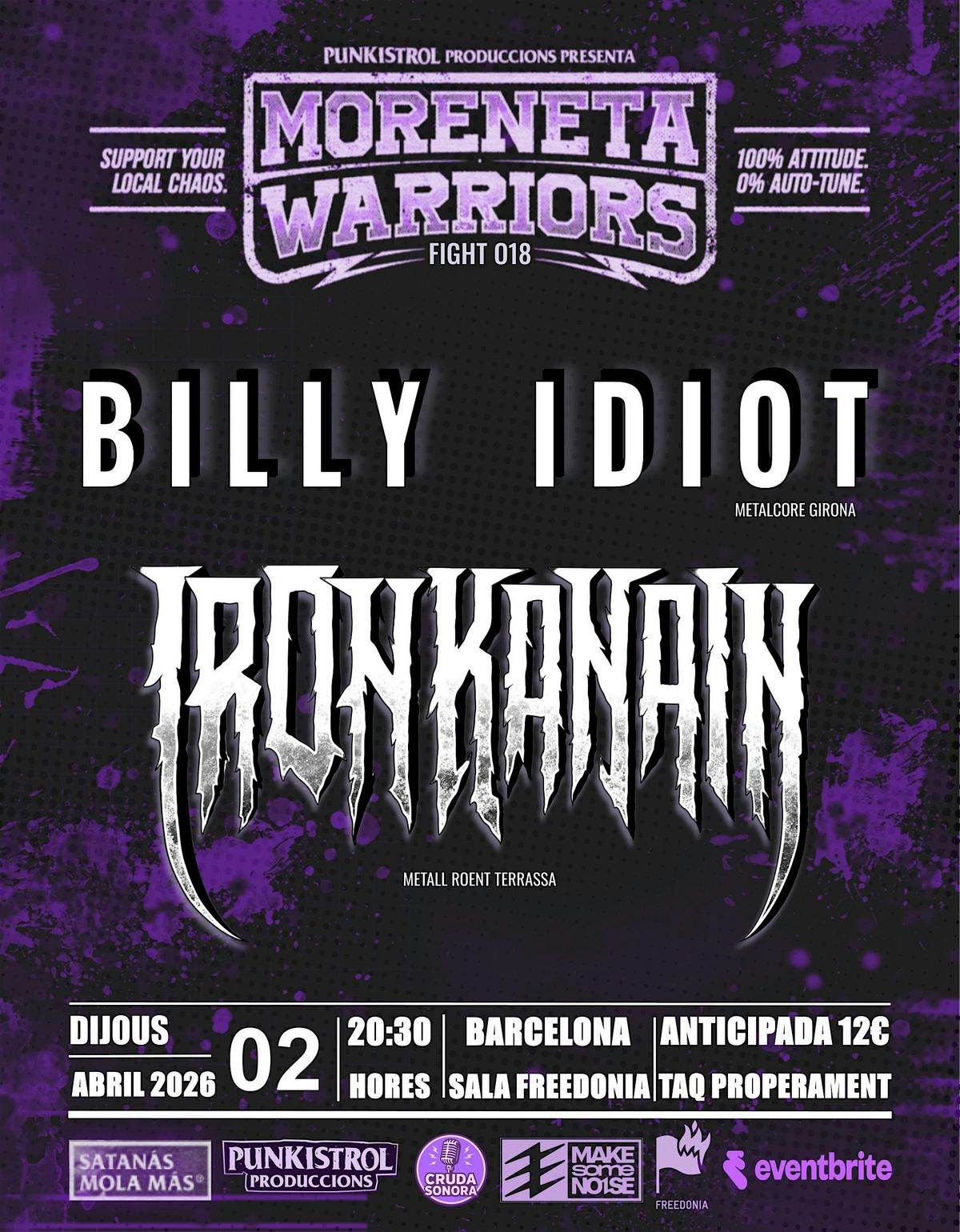 IRON KANAIN que ja tots coneixem sera el primer dels warriors de la nit, el segon warriors serà BILLY IDIOT, ells venen desde la provincia de Girona disposats a deixar el llistó dalt de tot.