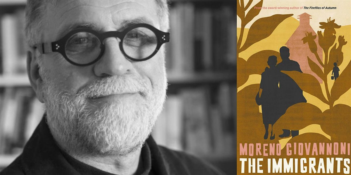 Image: Photo of author Moreno Giovannoni smiling with crowded bookshelves in the background. Next to this, the book cover image of The Immigrants by Moreno Giovannoni.