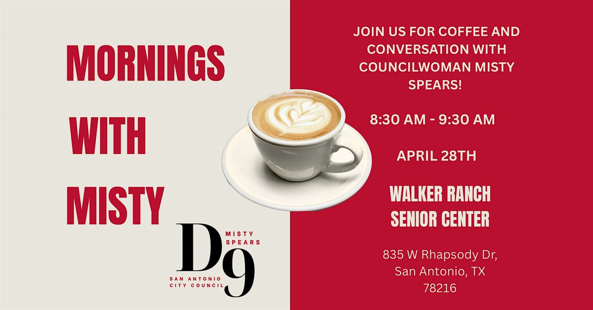 Mornings with Misty is a relaxed, come-as-you-are coffee gathering where neighbors can sit down with Councilwoman Misty Spears and have a genuine conversation about the topics that matter most to our community. Join us at Walker Ranch Senior Center on April 28 for a casual, welcoming space to ask questions, share your thoughts, and connect with your council office. Whether you have something specific on your mind or just want to stop by and say hello, we would love to see you there.