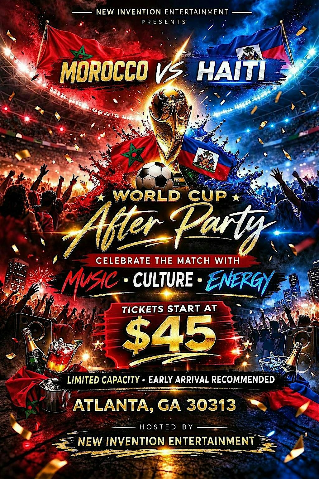 Get ready to keep the energy going after the big game! Join us in Atlanta,GA on June 24, 2026 at 9:00 PM (Eastern Time) for an epic after party celebrating Morocco vs Haiti.