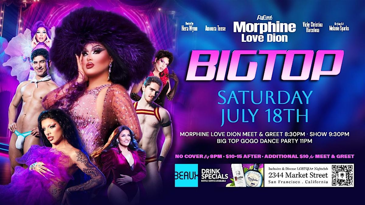 Morph*ne the lip synch dancing doll of Rupaul's Drag Race is coming to turn the party darlings! Only at BIG TOP SATURDAY only at BEAUX IN THE CASTRO. Big Top is now monthly on Saturday nights to offer the best in nightclub entertainment.