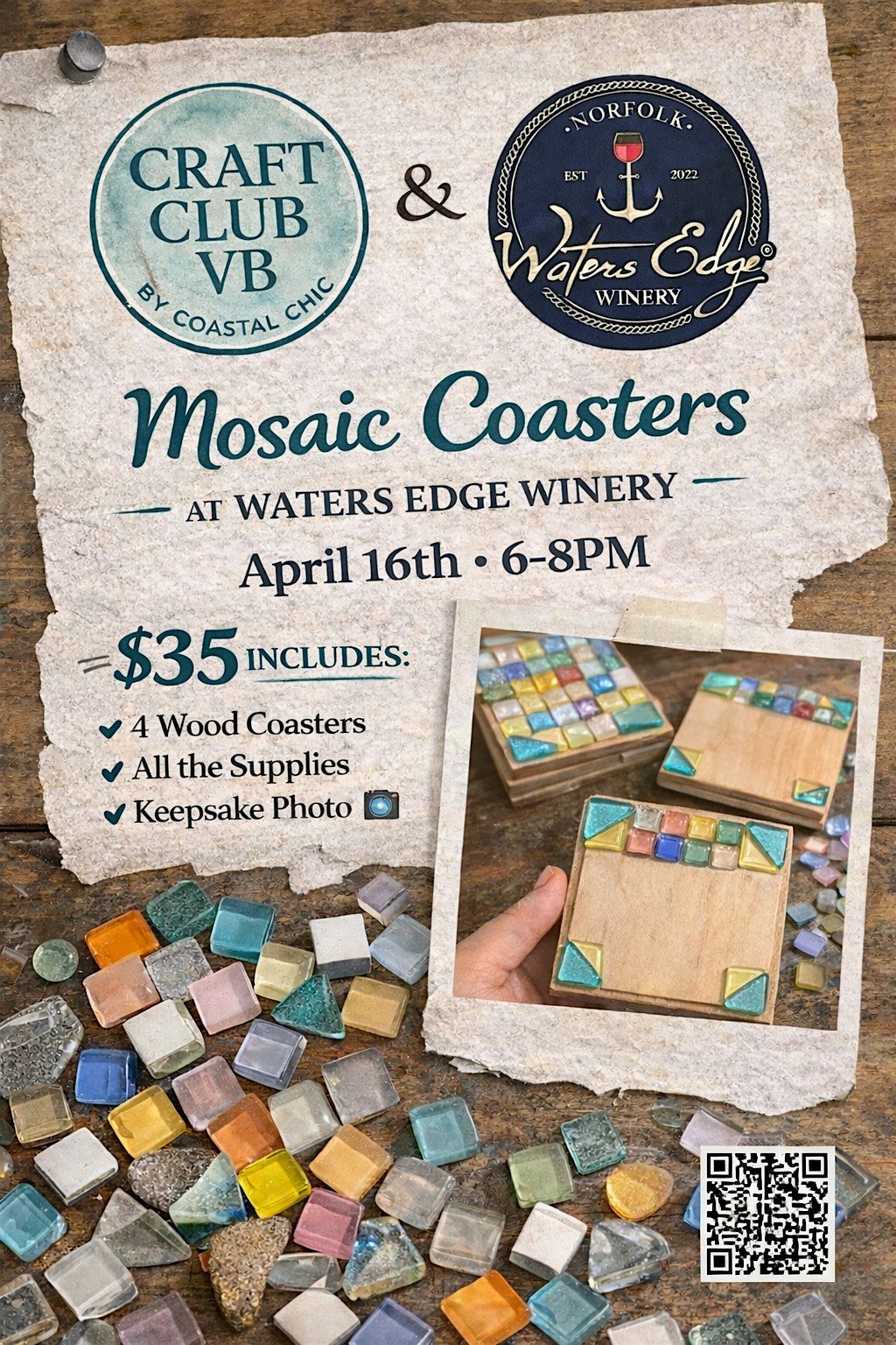 Join Craft Club VB for a creative night out at Waters Edge Winery in Norfolk as we design and create beautiful, one-of-a-kind mosaic coasters!