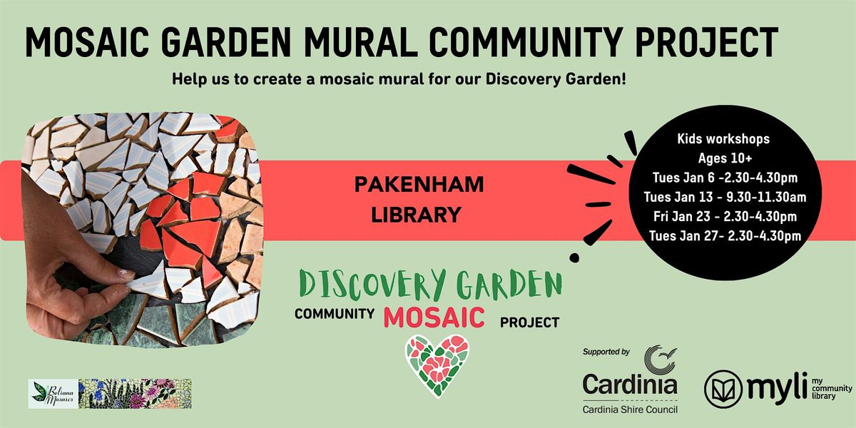 Pakenham Library would like to invite our community to help us create a lasting mosaic mural for our Discovery Garden! Belinda from Beliana Mosaics will facilitate each of the workshop sessions.
