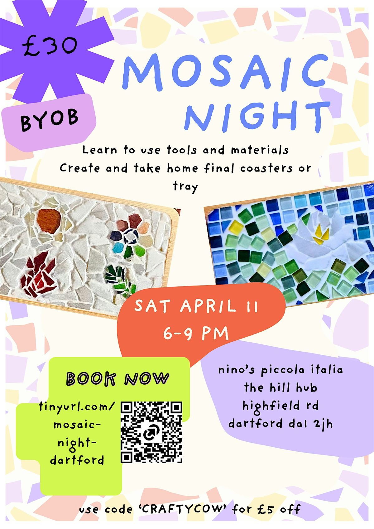 Join us at Nino's Piccola Italia on April 18, 2026 at 6:00 PM (BST) for a fun and relaxed evening! Whether you're a newbie or a pro, this is your chance to craft your own beautiful mosaic artwork. Bring your creativity and enjoy great vibes, good company, and a hands-on art experience. Don’t miss out on making something truly unique while having a blast!