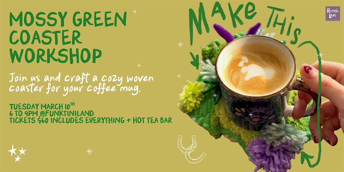 Join us for a cozy crafting evening where you'll learn to create your own textured mossy green coaster using beginner friendly weaving and latch hooking techniques!