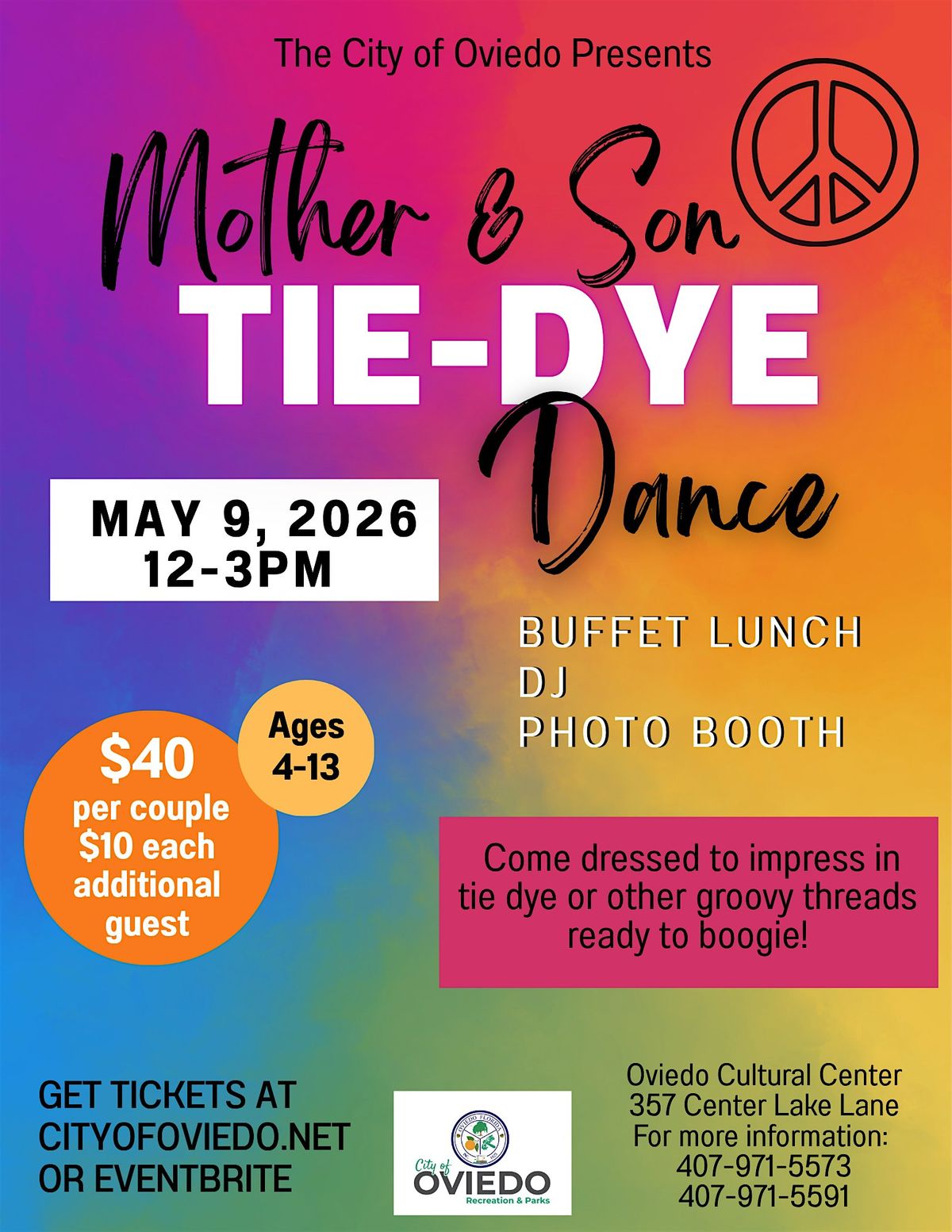 Join us for our Mother & Son Tie-Dye Dance for ages 4-13. Enjoy a buffet lunch, fun photo booth, and boogie the afternoon away! Come dressed in your tie-dye or other 60's-70's inspired outfit. We will sell out so get your tickets today!