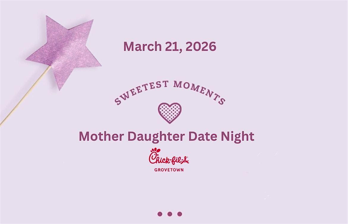 Purchase a ticket to one of the MOST sought after events of the year! Chick-fil-A Grovetown will be hosting our highly coveted Mother Daughter Date Night on March 21, 2026. Each ticket provides admission for mom and daughter and additional tickets may be purchased for additional daughters. There will be time slots available to select from. Each ticket comes with a complete meal for both mom and daughter, a special dessert, photo opportunities, a special craft and a take home gift for each daughter. All meals are served in our table side setting and each reservation lasts 50 minutes. Upon arrival, you will be escorted by one of our amazing Team Members to your table where you will find conversation starters for you and your daughter(s) and a special craft to work on. You will then be greeted by our wonderful server to take your order from our special event menu who will help guide you through the special date.