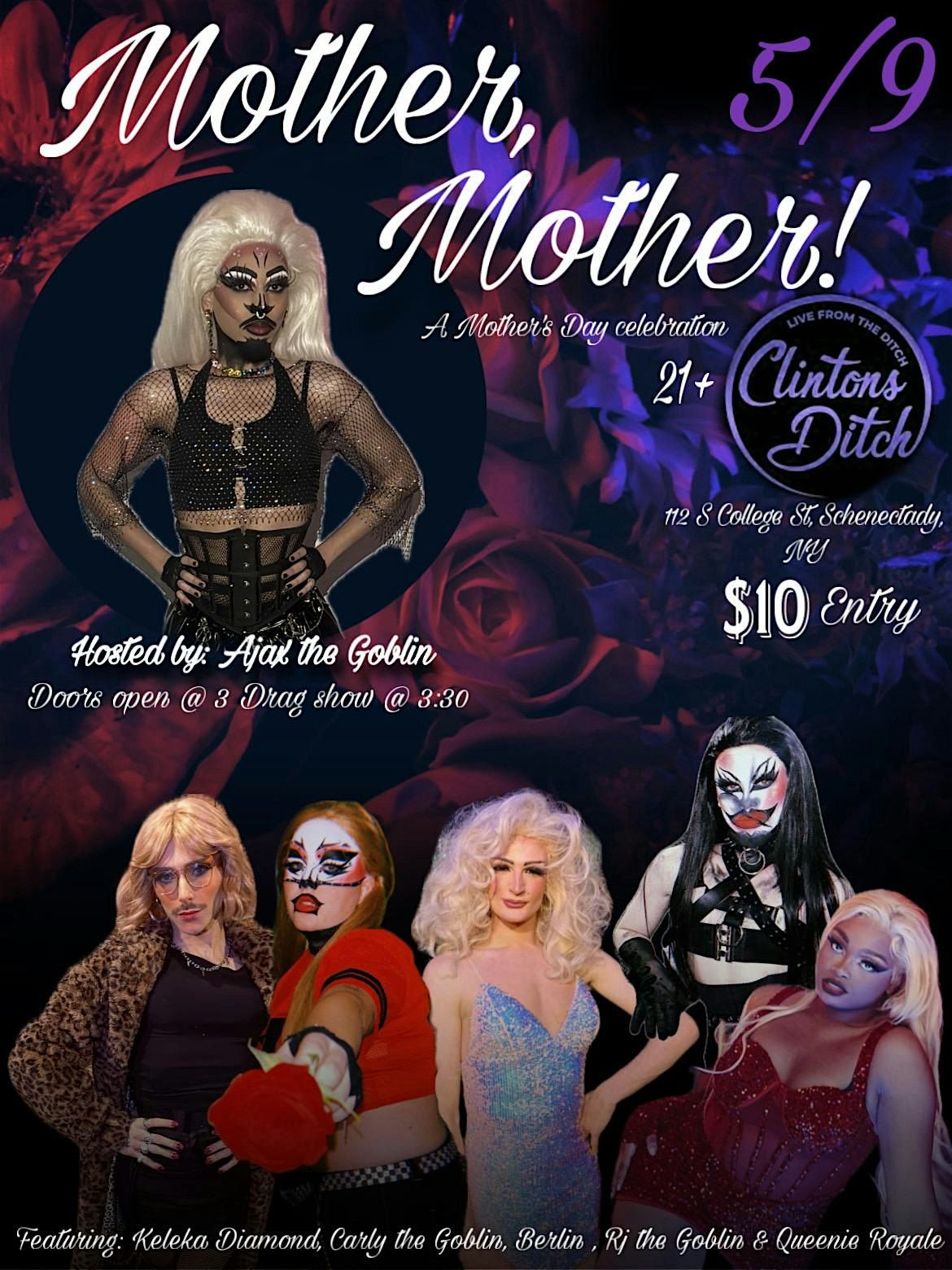 Come celebrate Mother’s Day early with us on Saturday may 9th at Clinton’s Ditch in schenectady, because mothers deserve the whole weekend! Get ready for a action packed drag show featuring your host Ajax The Goblin and co-host RJ The Goblin. With our wonderful cast, Carly The Goblin, Berlins Box, Keleka Diamond, and Queenie Royal. Doors open at 3, show at 3:30 with a 10$ entry fee(10$ cash at the door) . Our Dj will be playing beats to soothe the soul, while you have wings, frys, and drinks from the bar!