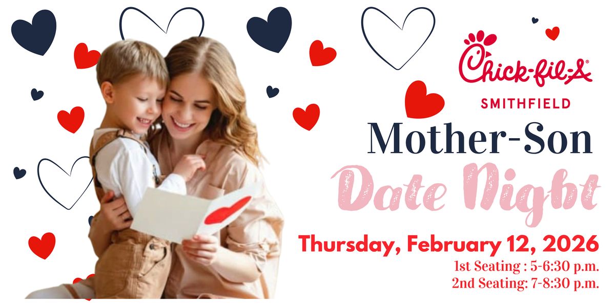 Celebrate love and special moments at Mother-Son Valentine’s Date Night at Chick-fil-A Smithfield. Enjoy a fancy restaurant vibe with a warm, festive atmosphere, a photo booth, meeting the Cow, and more, just for you and your son(s). Step away from the usual routine and create lasting Valentine’s memories together.