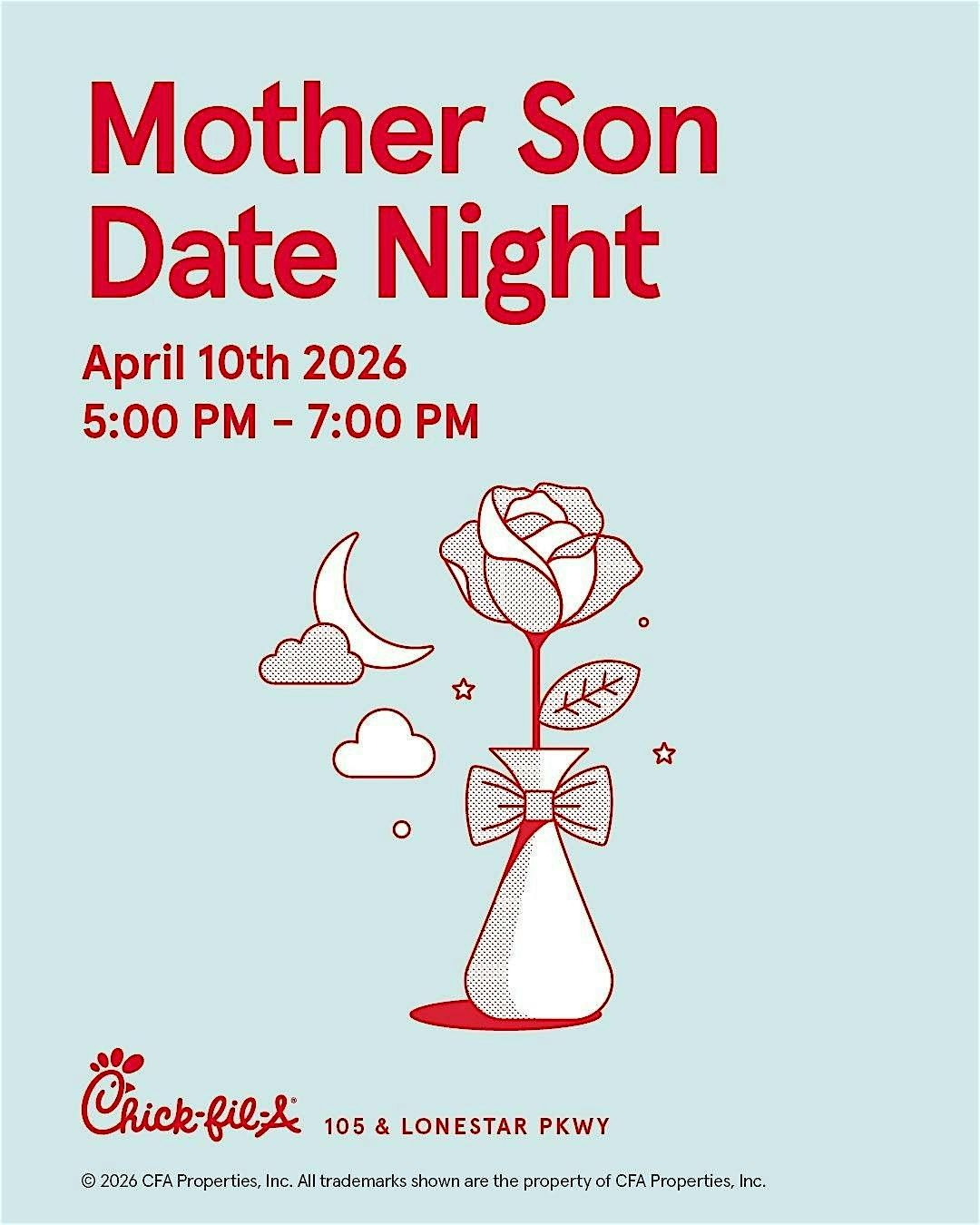 Join us for mother son date night April 10th. The first seat time is at 5:00 PM and the second seat time is at 6:00 PM. Please purchase tickets for each attendee, ticket price inclusion admission into event, activity, and dessert. Price of meal is not included.