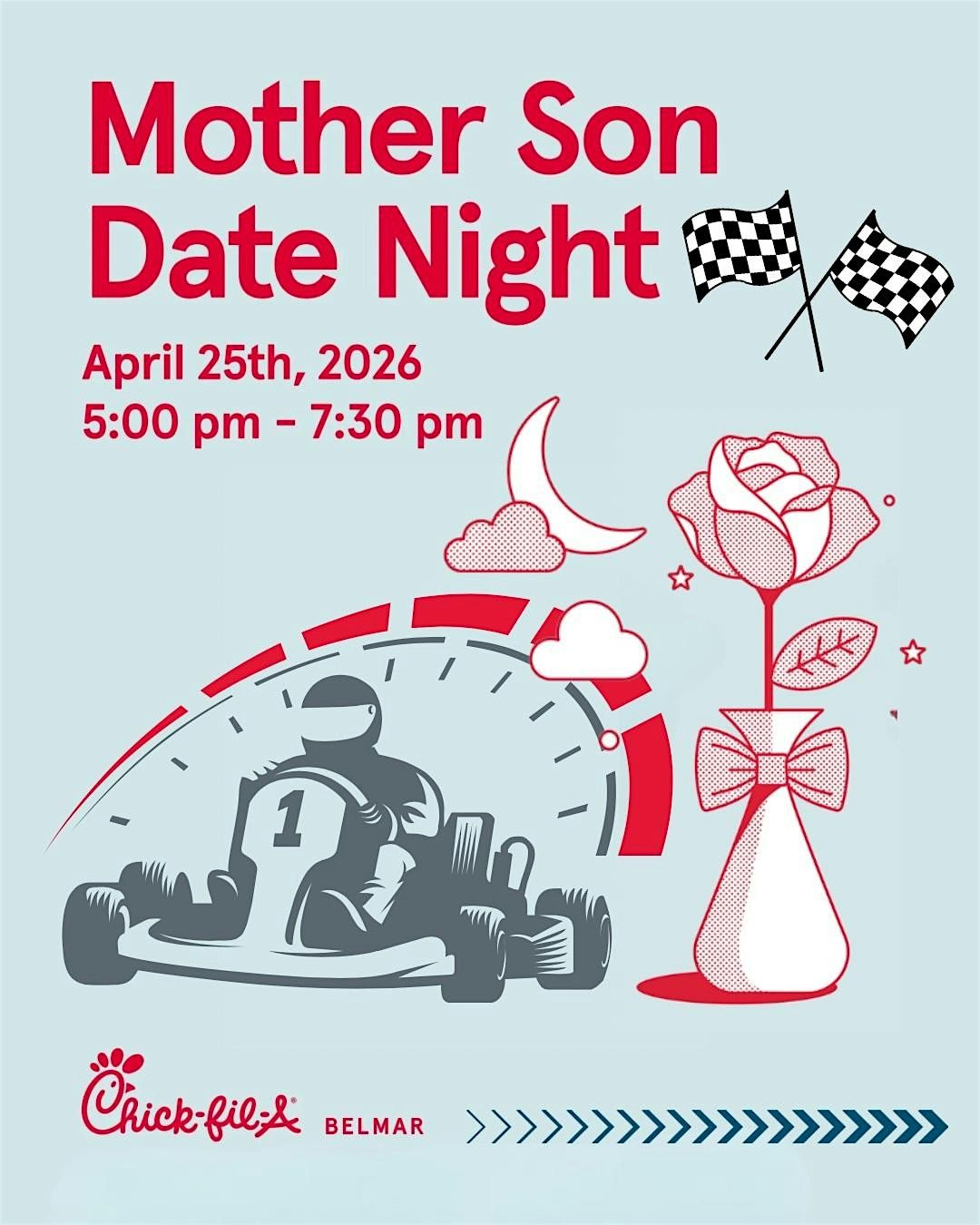 Cruisin' with Mom, a Mother-Son Night at Chick-fil-A Belmar that you won't forget. This is an RSVP Only event with a special side of our dining room blocked off just for you. Our theme is Race Cars and we will have fun activities provided. You may purchase dinner with our table side waitress and we will provide the treats. The restaurant will be decked out to our theme and it will be great quality time for you and your son. Cost will cover activities that we can provide and reserves your table so that we can avoid cancellations and get an accurate number on those who would like to attend. This will also allow everyone that is interested in this event the shot at attending so we don't have no-shows. Each reservation is limited spots so sign up as soon as you are able to in order to lock your spot in.