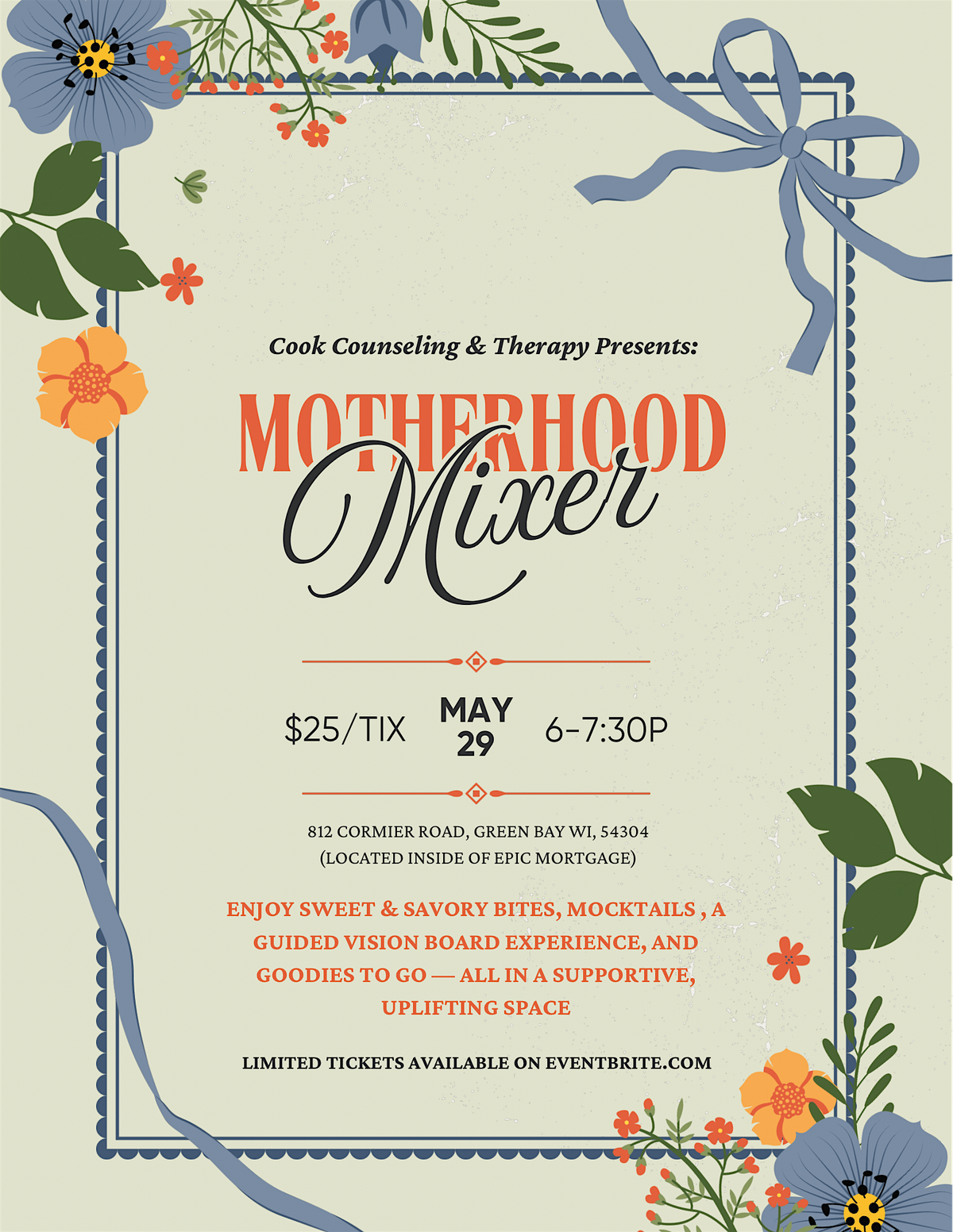 Step away from the daily hustle and join us for a special evening designed to refresh and inspire moms. Enjoy a curated selection of sweet and savory bites, handcrafted mocktails, and the creative joy of making your own vision board. Take home thoughtful goodies and leave with an uplifting message to carry with you into your next season of motherhood. Connect, recharge, and celebrate yourself—because you deserve it!