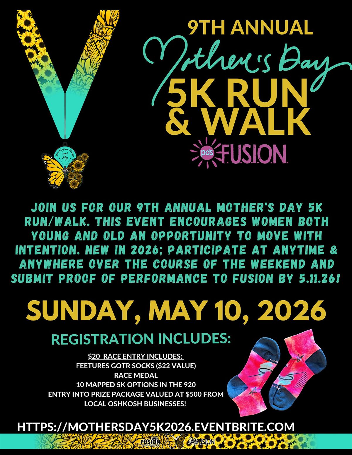 Join us for our 9th Annual Mother's Day 5k Run/Walk. THIS EVENT ENCOURAGES WOMEN BOTH YOUNG AND OLD AN OPPORTYUNITY TO MOVE WITH INTENTION. NEW in 2026; participate at anytime & ANYWHERE over the course of the weekend and submit proof of performance to fusion by 5.11.26!