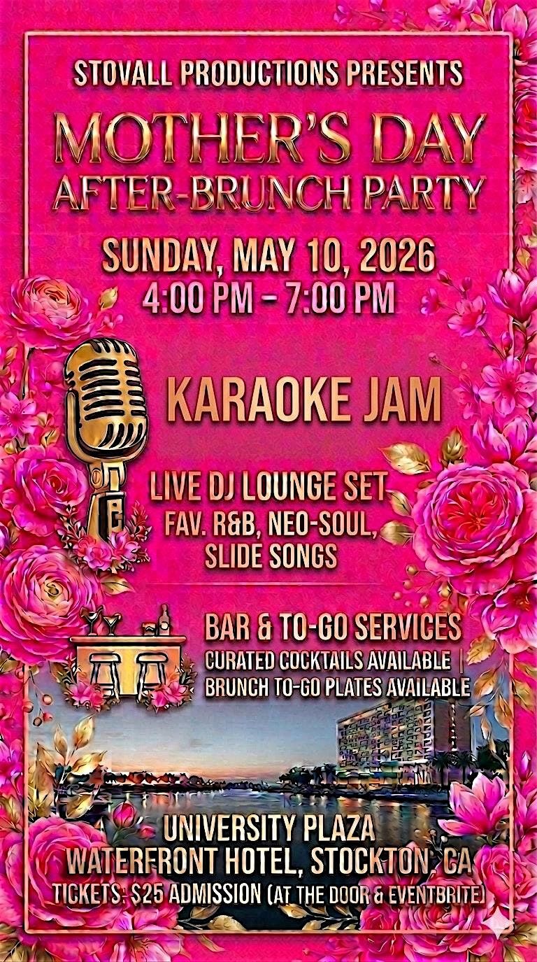 "Mother’s Day After-Brunch Party, Sunday, May 10, 2026, 4:00 PM - 7:00 PM, at University Plaza Waterfront Hotel, Stockton, CA. Tickets: $25About this Event