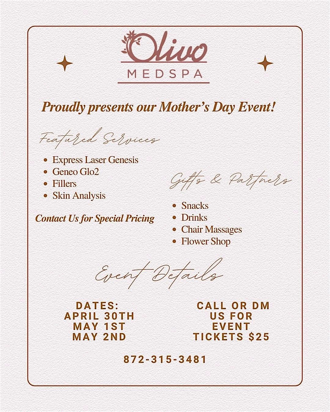 Join Olivo Medspa for an exclusive three-day Mother's Day event designed to celebrate and rejuvenate. This is more than just a spa visit—it’